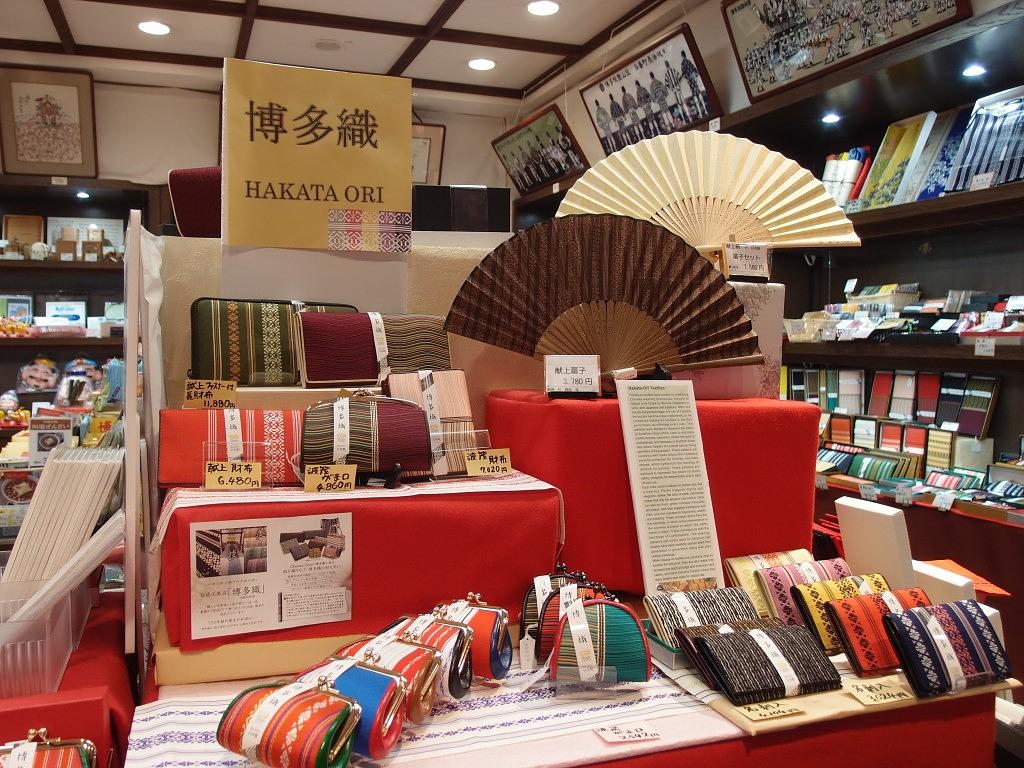 みやげ処では、博多織をパスケースやポーチにアレンジした雑貨が人気。お土産探しにもおすすめのスポットです。