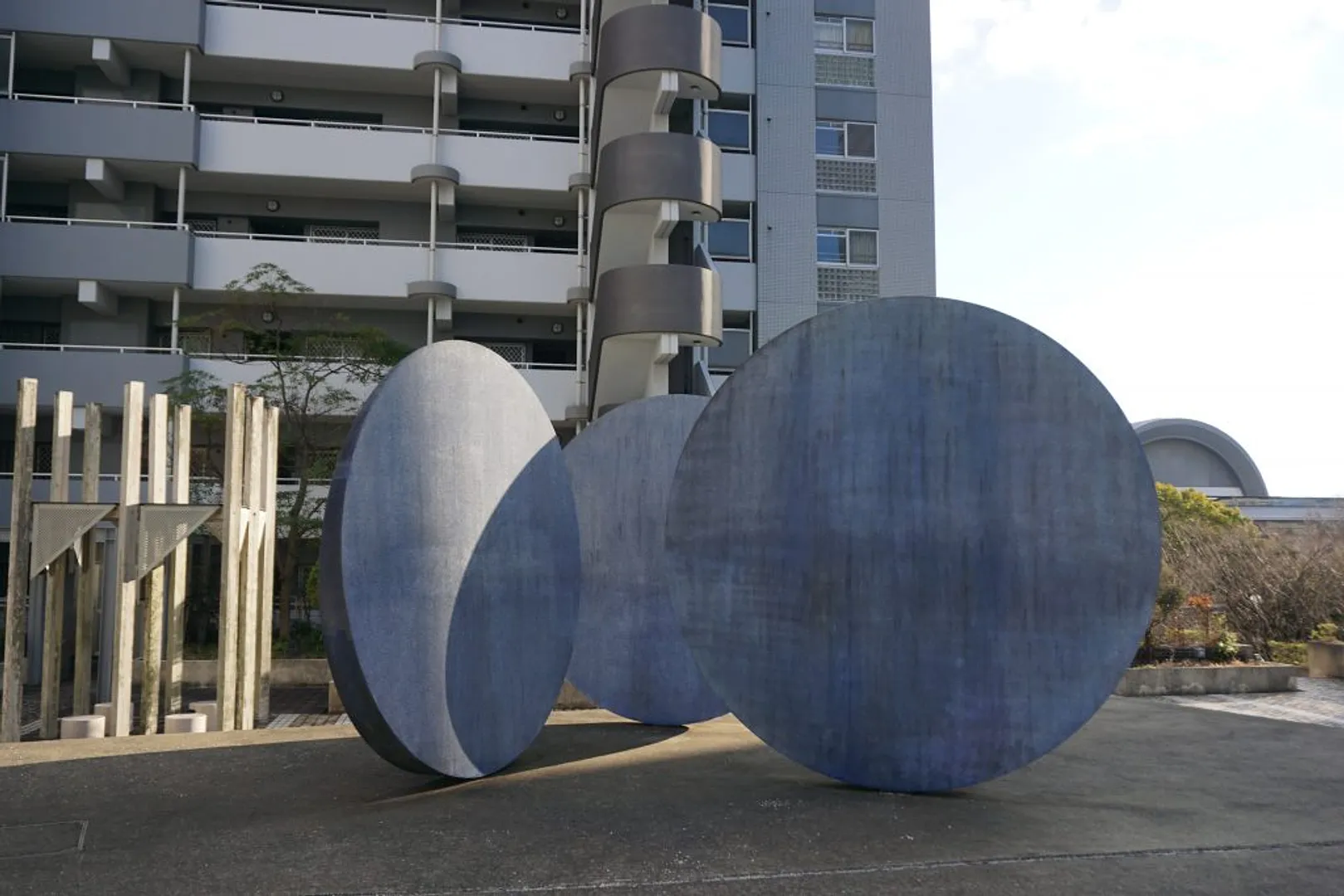 《ナイトシーン》を西側に進むと、今度は、紺碧の円盤のモニュメントが出現します。作者は韓国、ソウル出身の崔在銀さん。1972年の来日をきっかけに生け花に魅せられ、草月流の三代目家元・勅使河原宏氏に師事し、生け花の器に花を生けるという表層を超えた空間概念や宇宙観を学んだといいます。