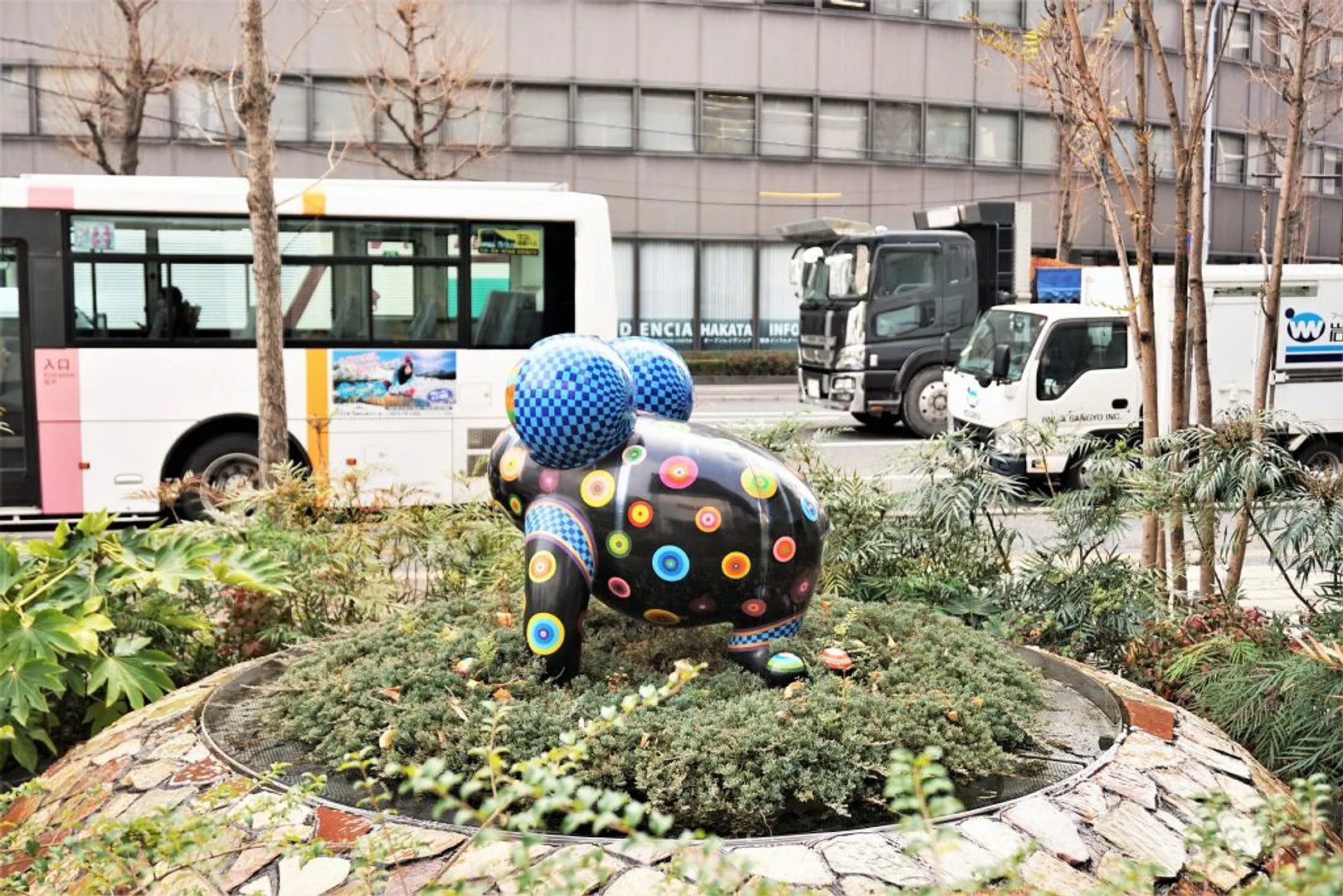 カラフルで独特な意匠、大きな目の動物のパブリックアートを手がけることで知られる、台湾の作家の作品です。通称「クリスタルの泉」に棲み、キャナルシティ博多の水を永遠に美しく保ち、人々に幸福をもたらす不思議な力を持つラッキーフロッグだといわれています。ぜひ、そのご利益にあやかりたいですね。