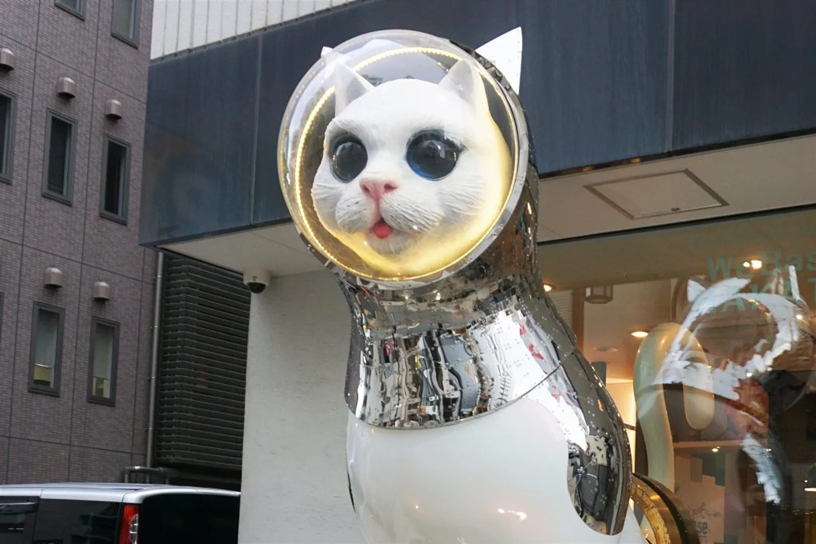 作者のヤノベケンジさんは、数々の巨大立体作品を発表し注目を集めている現代美術作家。この作品も高さ3メートルあり、そのインパクトで道ゆく人の足を止めています。「守り神」であり「招き猫」でもありますね。ちなみに、愛称は「ニャーピー」。